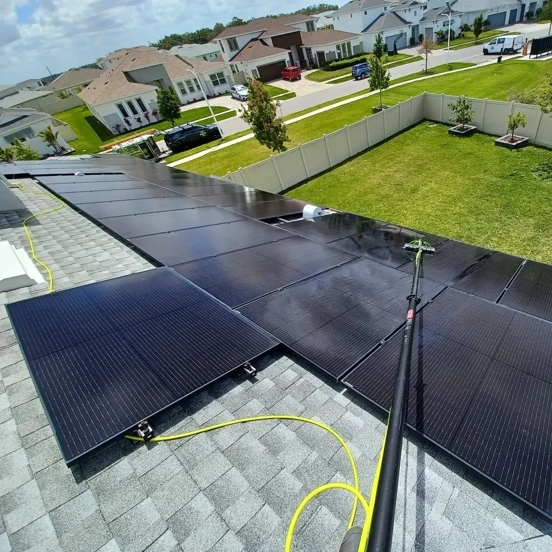 By using pure water (deionized water), we ensure that the solar panels are cleaned without leaving any deposits that may block sunlight from reaching the solar cells. This will help to maintain the panels' efficiency, resulting in maximum energy production and ultimately saving the customer money in the long run. Pure water (deionized water) is an eco-friendly solution, as it does not require any harsh chemicals that may harm the environment or damage the panels.